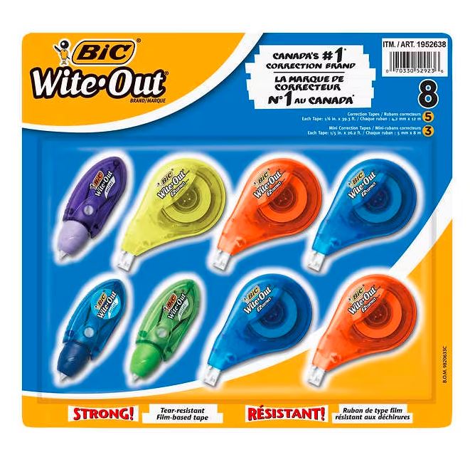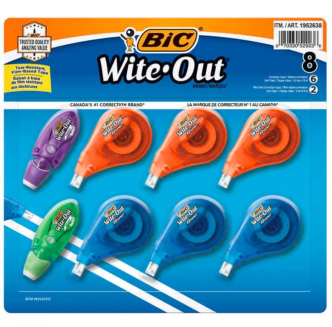 EZ Correct Correction Tape from BIC Wite-Out Brand can be used to quickly correct documents that were written or typed. Unlike the correction fluid white out liquid, this dry correction tape, which is made by Canada’s #1 Correction Brand*, enables you to make immediate corrections without making a mess or waiting. The tape is easy to use: Simply position the tip flat on your paper, hold the dispenser in the groove with your thumb, press firmly, and gently move from left to right. This film-based correction tape is stronger than paper-based tape in its tear resistance, allowing for neat, undetectable corrections that last. You will be able to apply the tape with ease and precision thanks to the self-winding mechanism, which helps keep the tape from coming undone. The dispenser’s translucent body also lets you see how much tape is left.