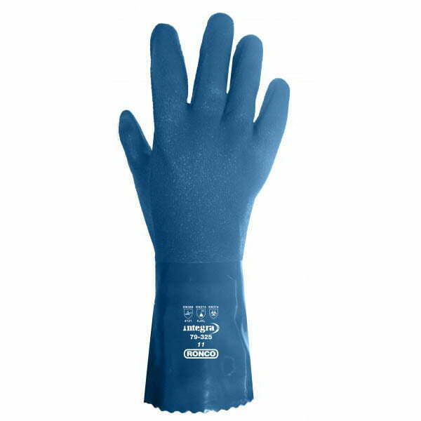 RONCO Integra™ 79-325 is a premium chemical protective glove made from a special blend of polymer materials to enhance performance. This 3rd Generation PVC glove from RONCO is more flexible, soft and hand-forming than standard triple dipped PVC gloves of the same chemical calibre. The gloves provide excellent resistance to oils, fats, solvents and a variety of other chemicals, including acids.